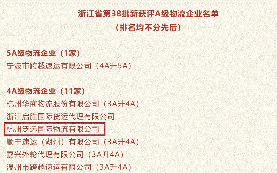 2024年8月26日,中国物流与采购联合会发布第三十八批A级物流企业名单。杭州泛远国际物流有限公司榜上有名,荣获国家“4A级物流企业”称号。 杭州泛远国际物流有限公司凭借卓越的服务和创新能力,成功跻身A级物流企业之列,标志着公司在行业中的领先地位和专业实力得到了国家级权威机构的认证。